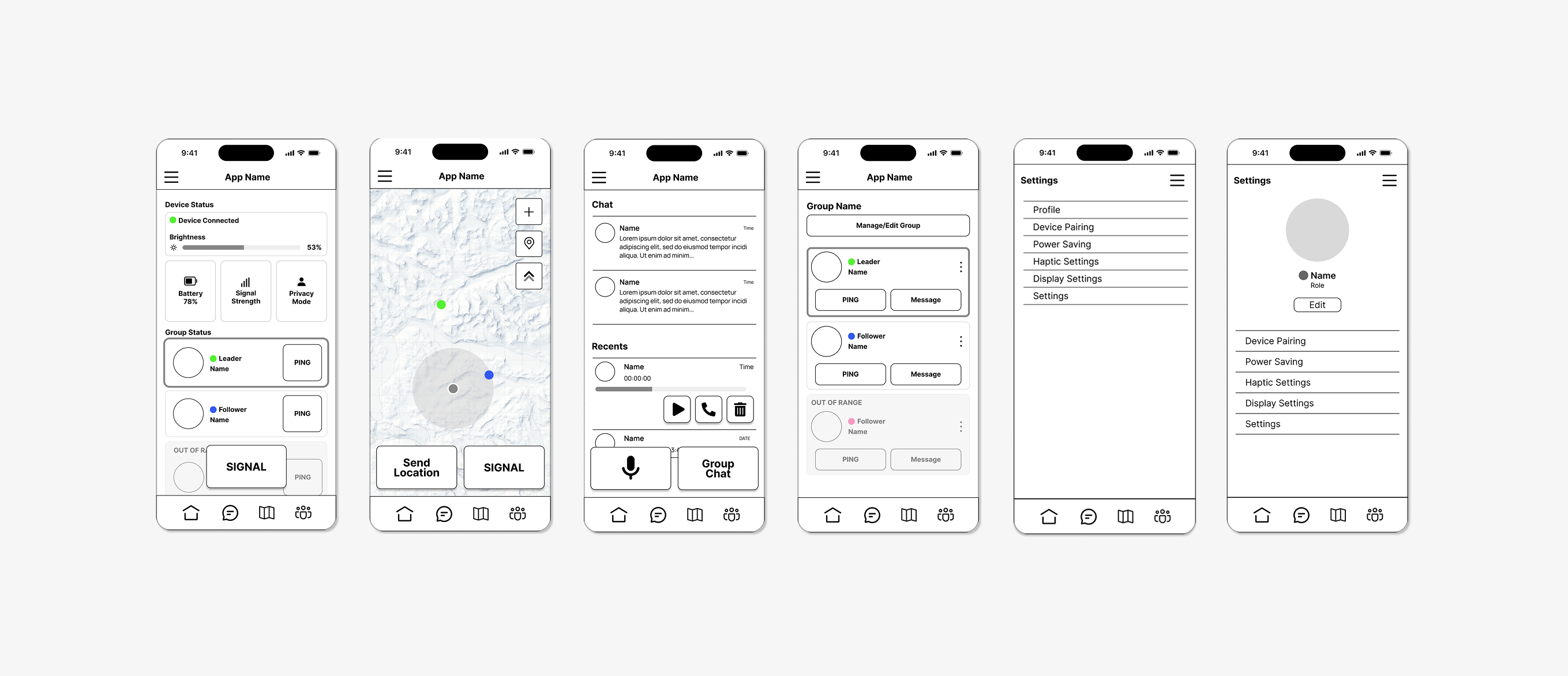 To better understand how the main functionalities would integrate with the physical product, I created wireframes that explored various functionalities and how they would potentially interact with the goggles. These concepts were tested with users to gather feedback, which helped clarify system relationships and informed iterations. Insights from this testing guided the development of the final prototypes, ensuring the experience was intuitive and aligned with user needs.
