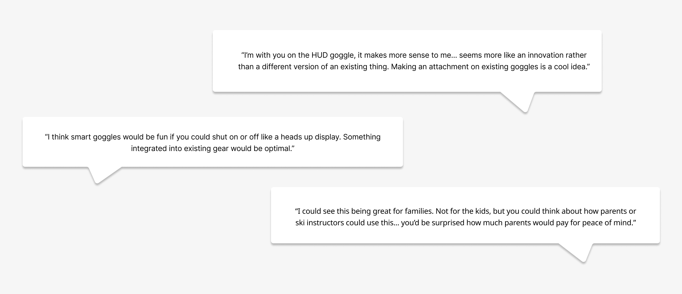 We interviewed 15 ski and snowboarding enthusiasts, instructors, and industrial designers to understand user expectations. Participants consistently favored the HUD goggle concept for delivering glanceable, real-time information without disrupting the experience. These insights reinforced the HUD as the product’s key differentiator and guided the interface design to balance clarity, usability, and seamless integration with the physical form.