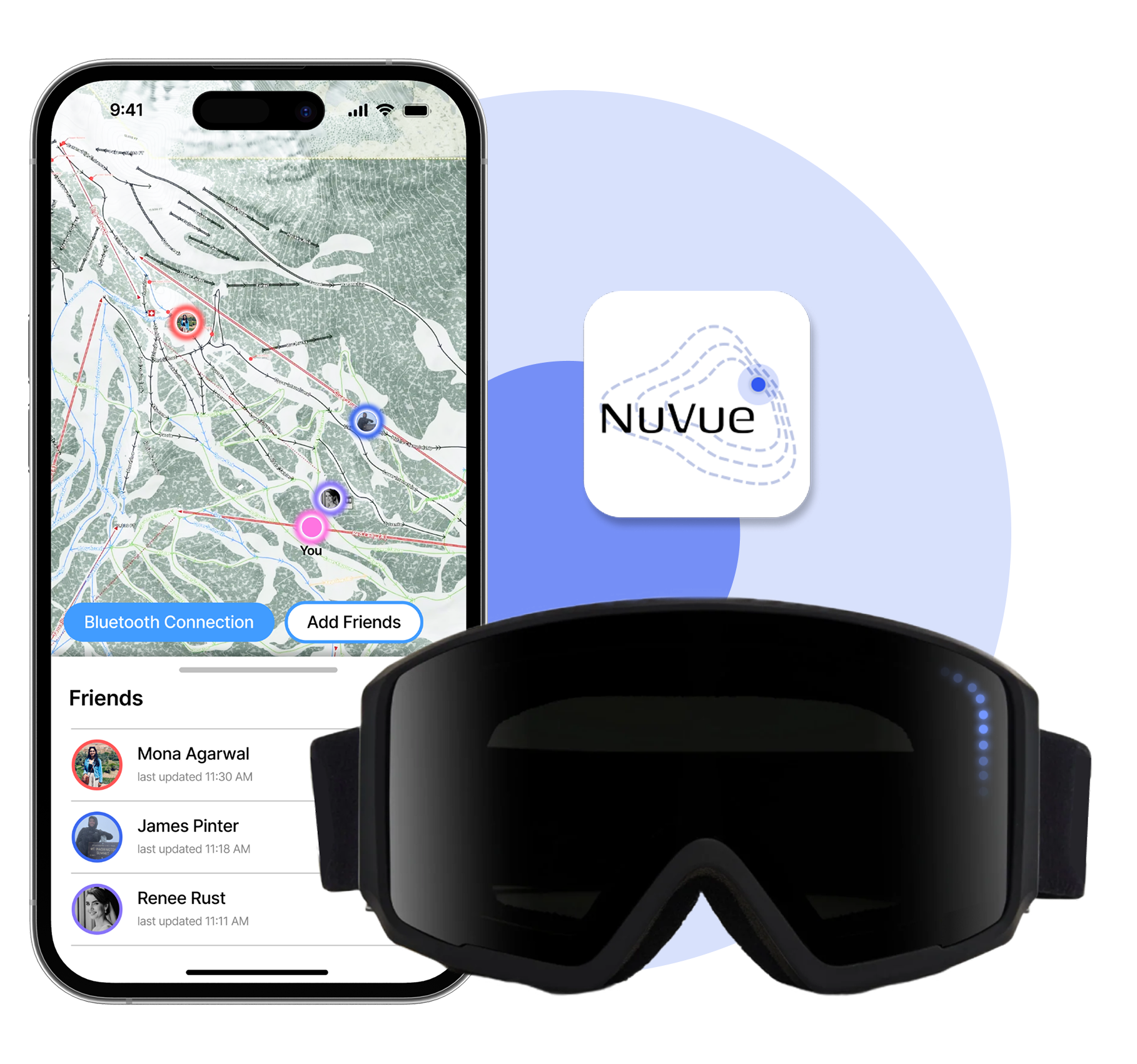 NuVue is a smart goggle and companion app system that helps skiers and snowboarders locate and reconnect with group members on the mountain. By using real time spatial awareness and intuitive visual cues within the goggle display, the experience reduces the stress of getting separated and makes coordinating on the slopes more seamless.