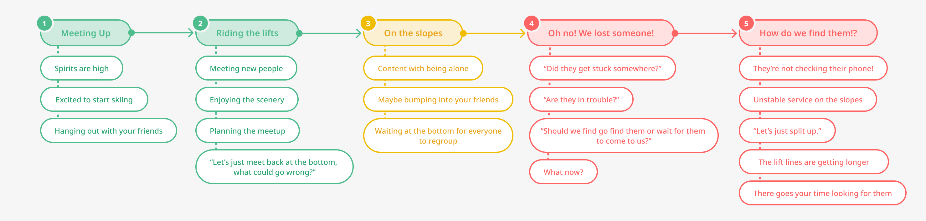 We compiled our research and developed a user journey map of the typical slope experience we hope to better and enhance through our products. It is in between steps 3 and 4 where our product would interfere and help users navigate back to group members.
